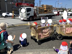 いせきひろばで あそんだ あかさん きちんと ならんで かえります
