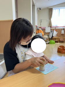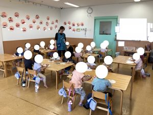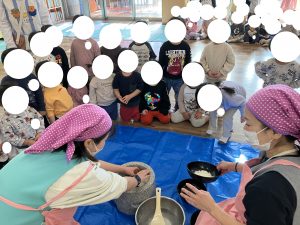 クラスごとに おもちを そばで みてみます ひよこさん これは なんだと からだが ひけています