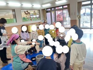 みどりさんが だいひょうで きねをもって おもちを つく たいけんを しました できあがった おもちを ちかいところから みようと みんなのわ が ちいさくなっています