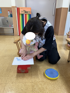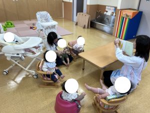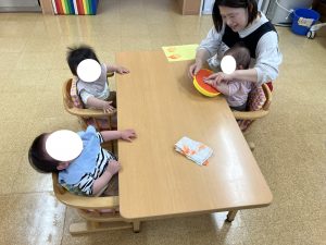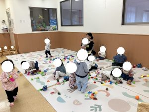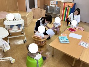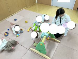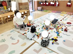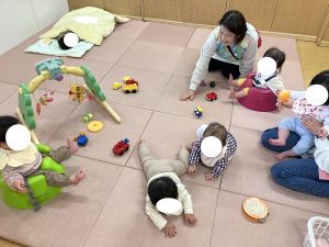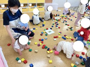あかさん おもちゃや えほんを さわったり あそんだり なかよく あそびました