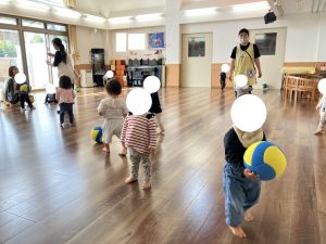 あかさん ホールで れつになって あるくれんしゅうのあとは ボールあそびをしました