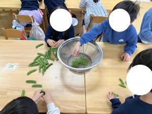 みどりさんになってからの はじめての おてつだい グリーンピースのかわむきをしました