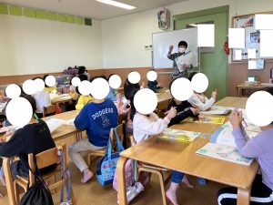 こんねんどの えいごのじかんが スタートしました はじめてのぞむ あおさん せんせいのいきおいに おされてしまった~・・・