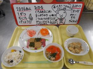 サンフィールおせち を いただきました いろあざやか まつかさやきは いちまつもよう ことしも げんきに おいしい きゅうしょくを いただきたいと おもいます