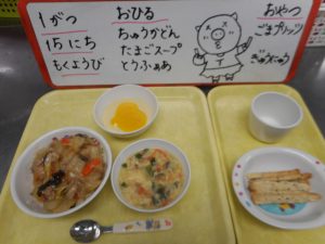 たのしい じかんのあとは おいしい きゅうしょくのじかん    ふわふわたまごがたくさんはいったスープ ぐざいたっぷりの ちゅうかどん おいしく いただきました