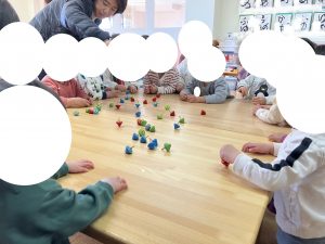 もちろん ぶんえんのおともだちも きてくれました テーブルを かこんで こままわしにちょうせん