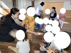 ひよこ あか ぶんえんのあかさん せんせいから すずや タンバリンを うけとります