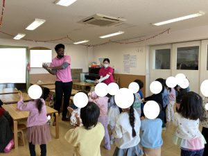 えんていで ひとあそびしてから  ももさん えいごのじかん    ぜんかい れんしゅうした のりものの たんご こんかいも ちゃんとおぼえていて せんせいがたも びっくり