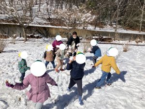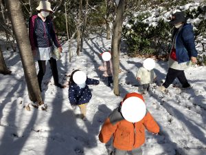 ぶんえんのおともだちも いせきひろばで ゆきだるまを つくり・・・
