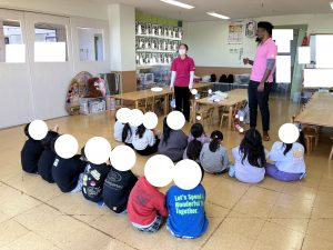 きょうは えいごのじかん あおさん せんせいがいったすうじと おなじにんずうのグループをつくる ゲームに ちょうせんです せんせいも かつやくしました