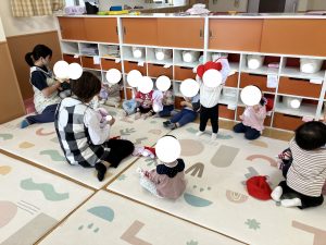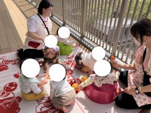 ひよこさん テラスで ひなたぼっこ おもちゃを てにとったり おともだちのかおを のぞきこんだり まだまだ ほいくえんせいかつ はじまったばかり!